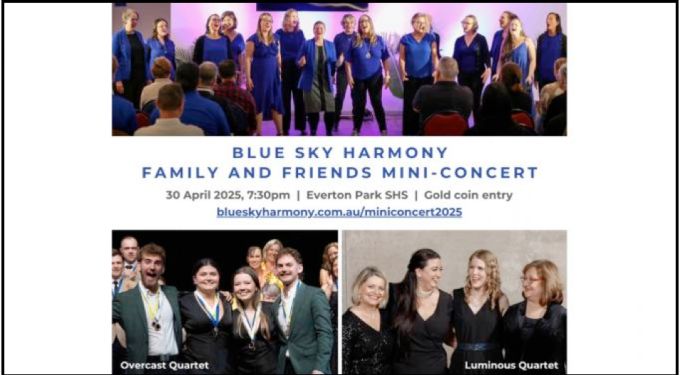 This mini-concert will run for approximately 1 hour, with refreshments to follow. Entry to this event is only a gold coin donation at the door! Please complete the registration form on our website so we know how many chairs to set up, and can send you parking information and any other updates: https://www.blueskyharmony.com.au/miniconcert2025